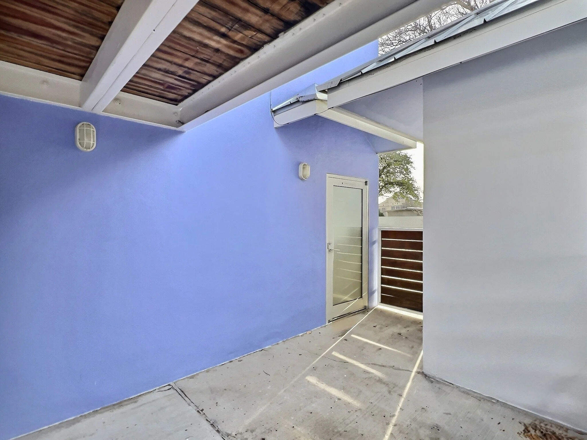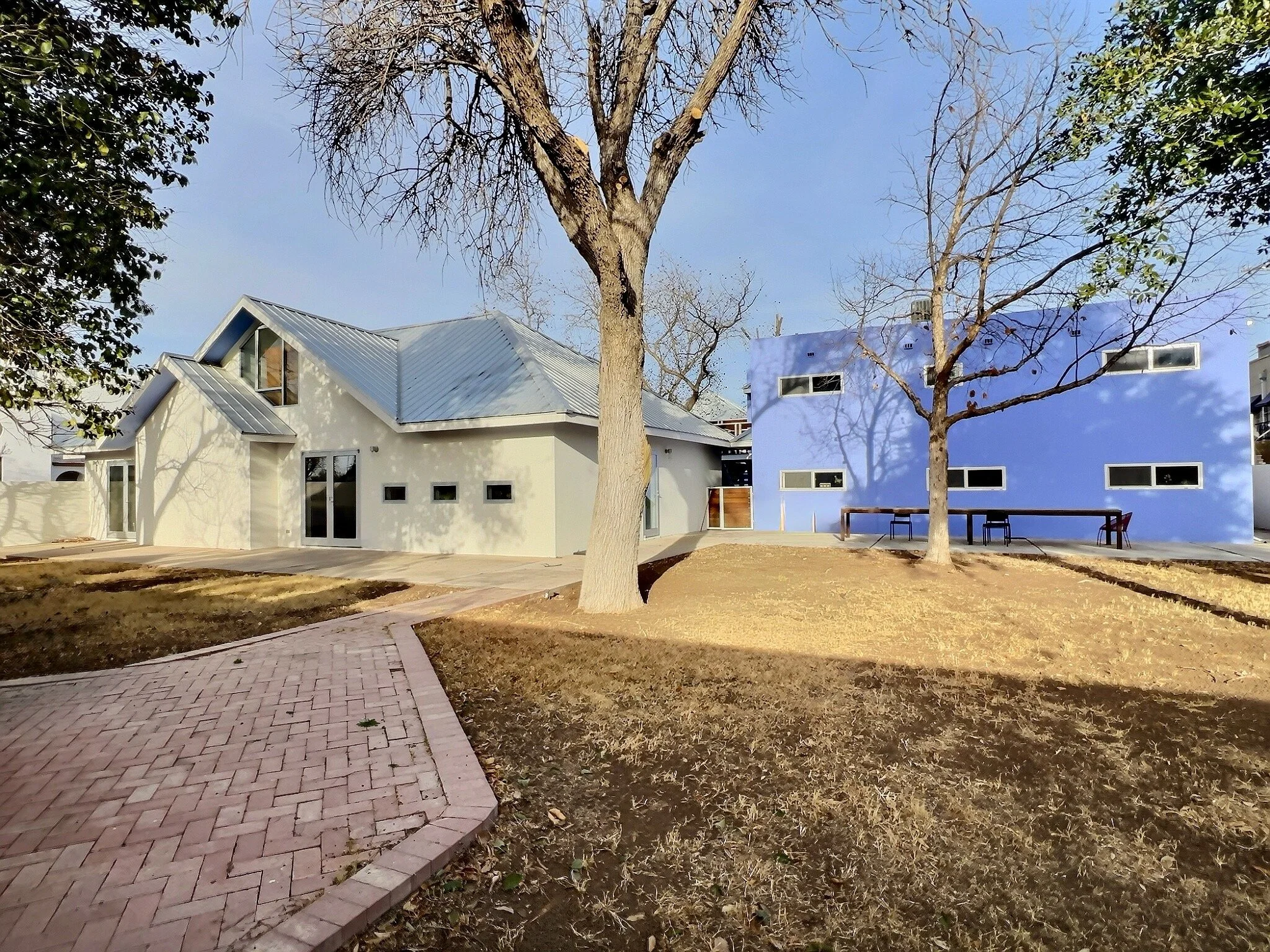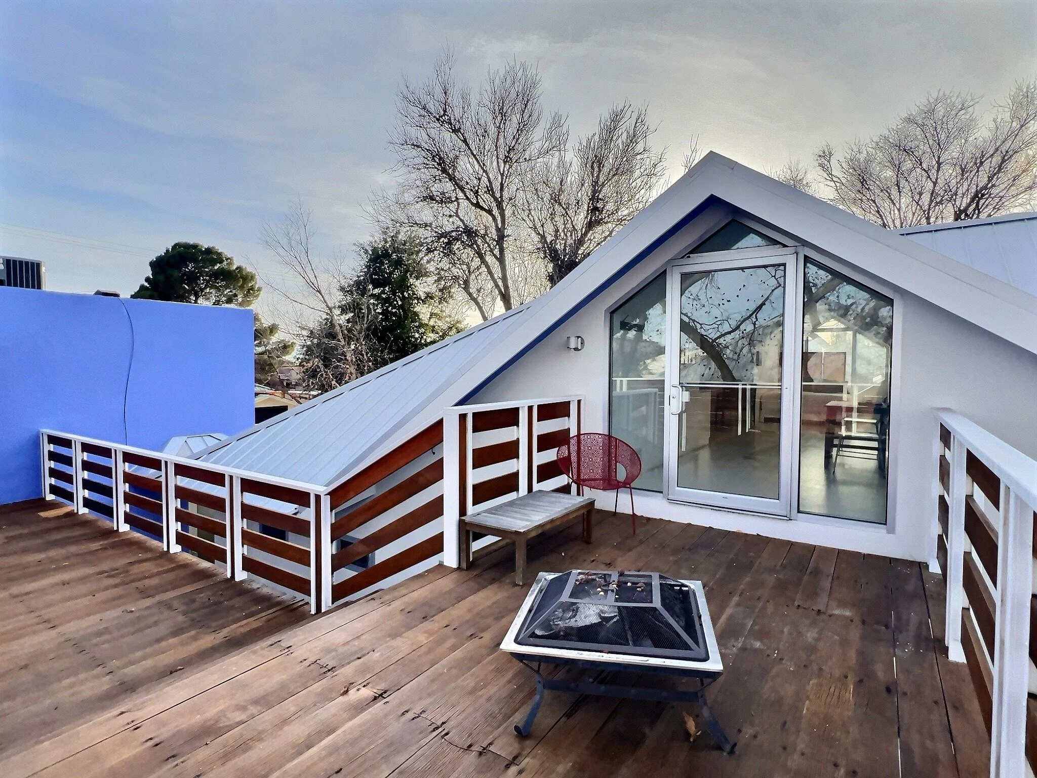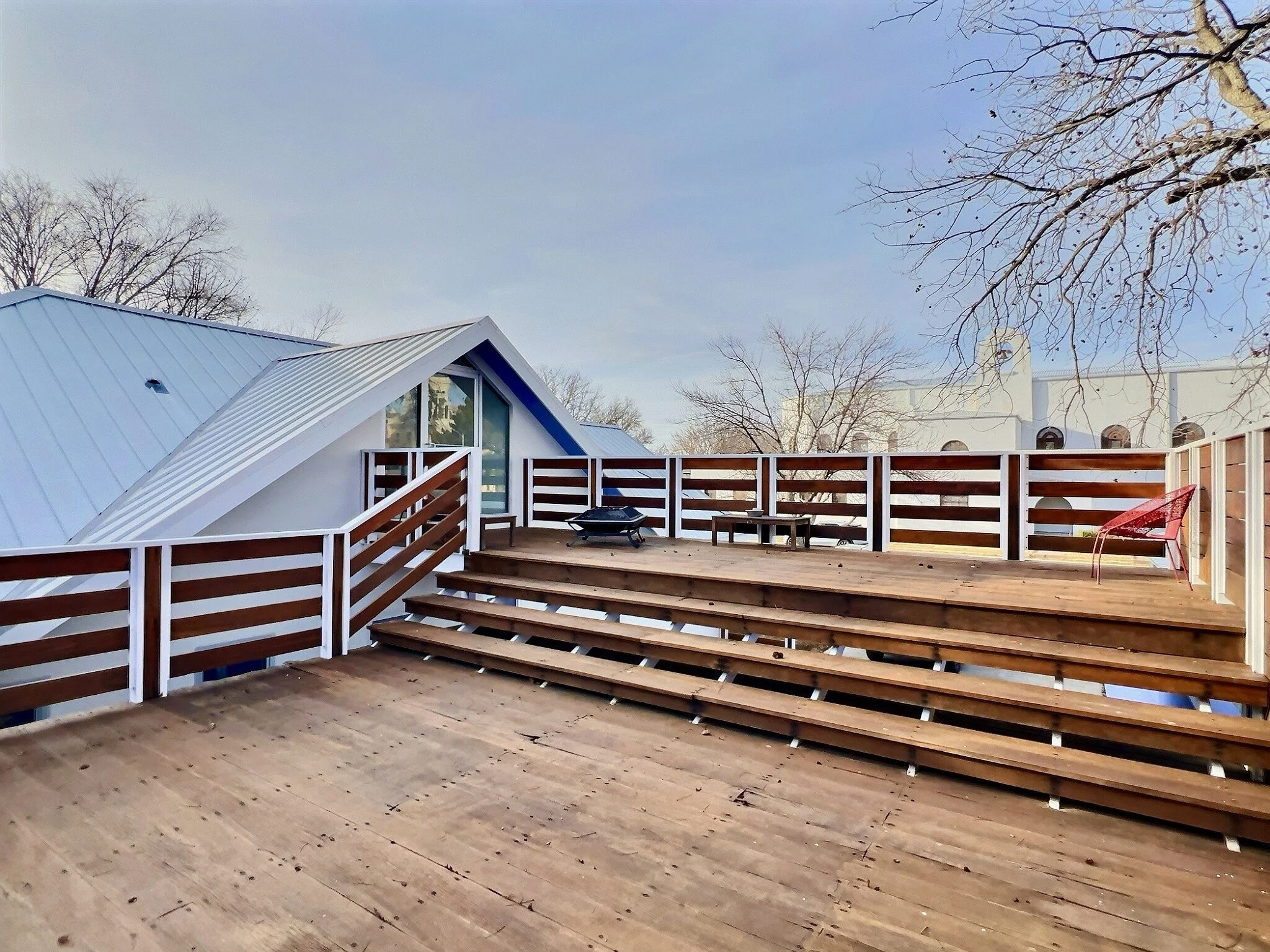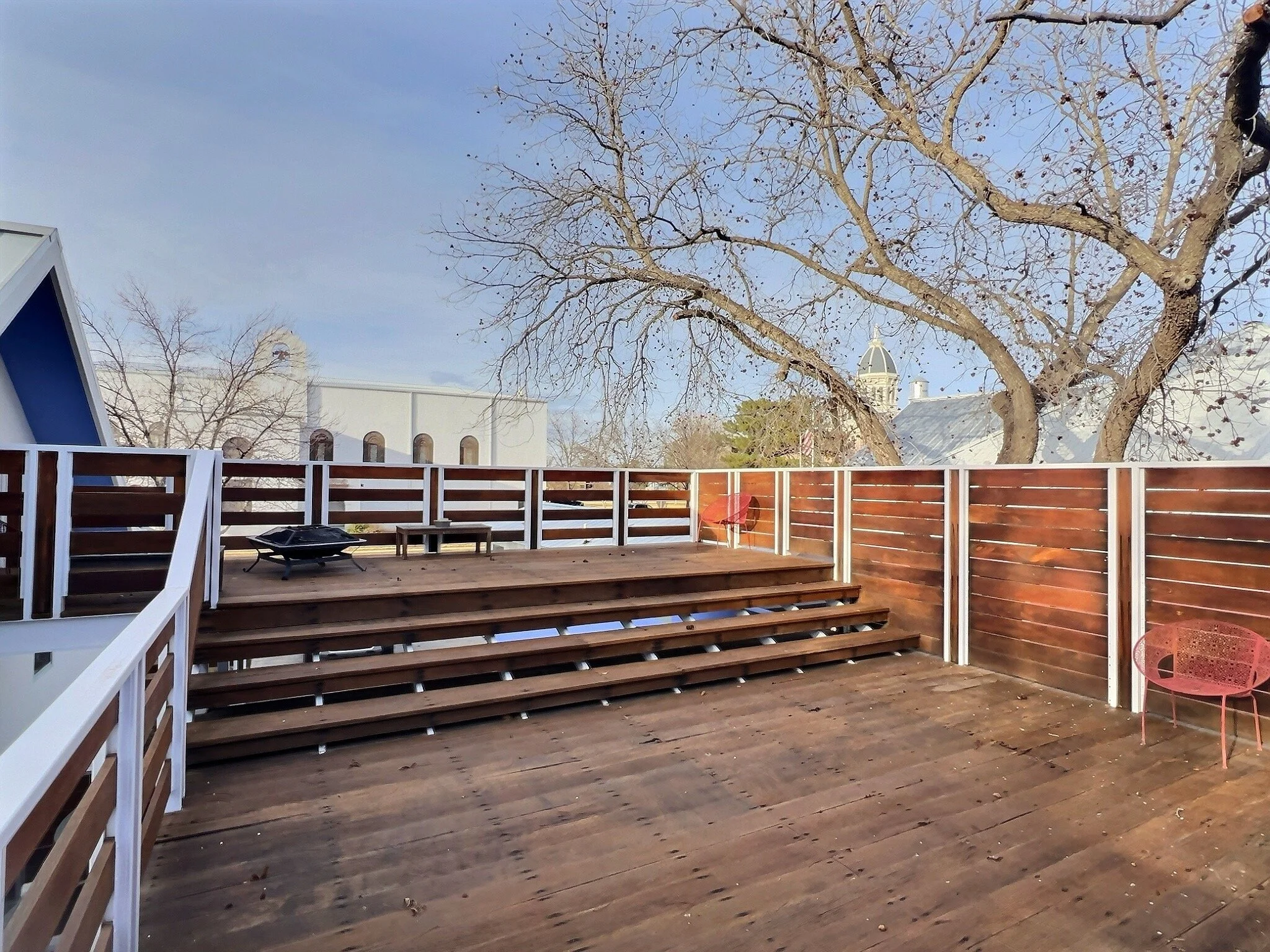 The secondary two-story building is accessed through the carport or backyard and features separate entrances for each unit. The property includes three additional units total: two two-bedroom units and one studio apartment. The downstairs space—currently used as a home office—offers a full kitchen and full bath and can easily be converted back to residential living. Upstairs, two units open onto a shared roof deck with stunning views of the courthouse. One unit features two bedrooms, one bath, a spacious living room, and a full kitchen, with additional access via a rear staircase from the backyard or alley. The second upstairs unit is a refined studio with elegant lines, a full bath, and access to the deck.