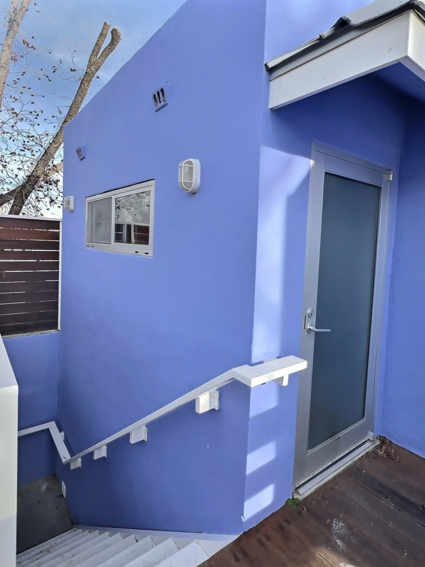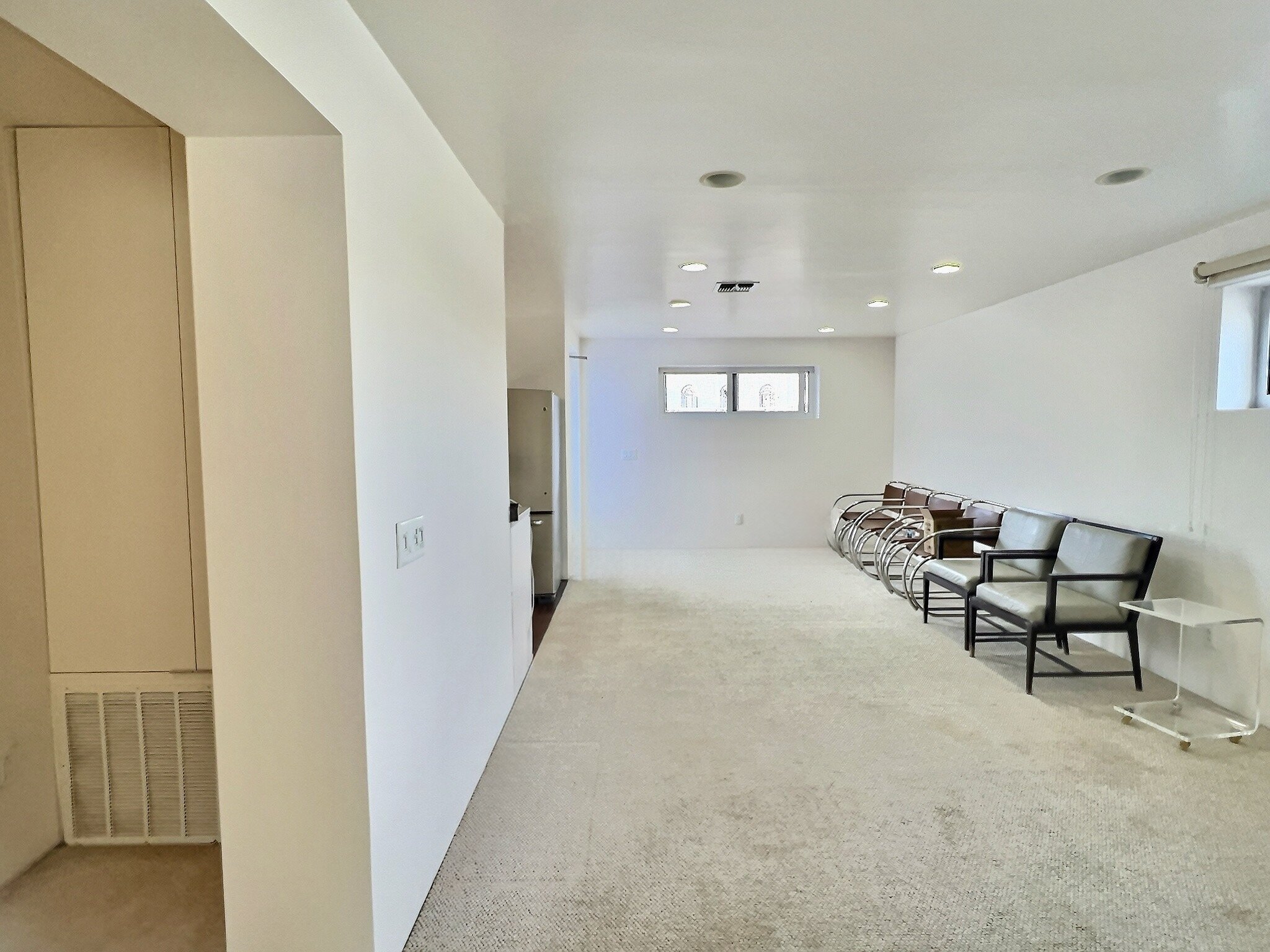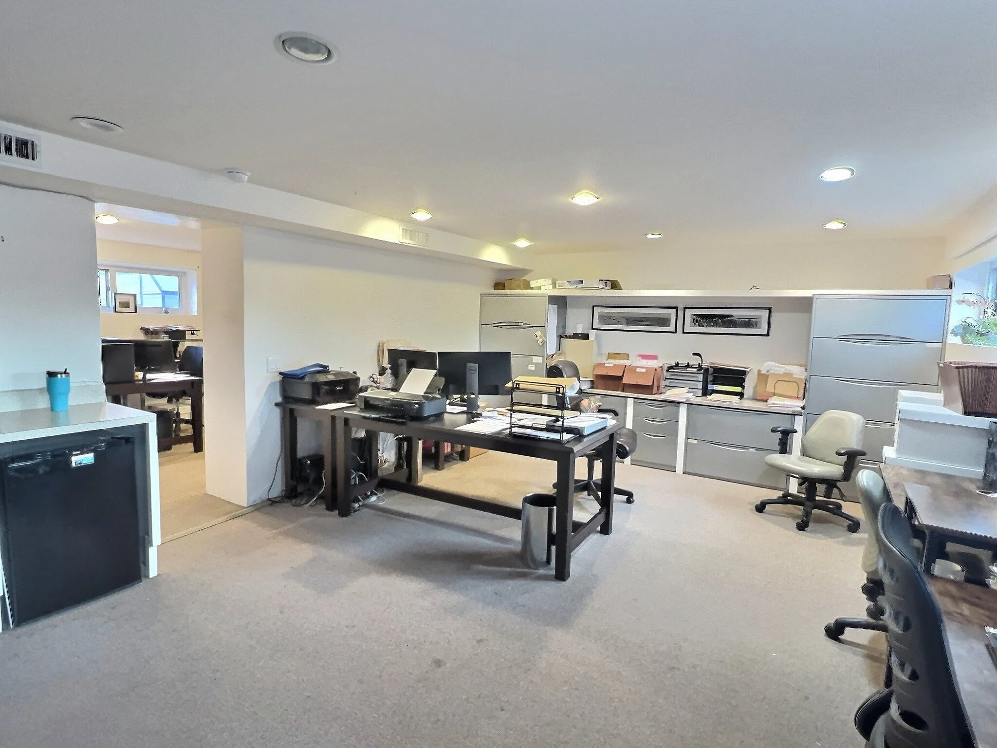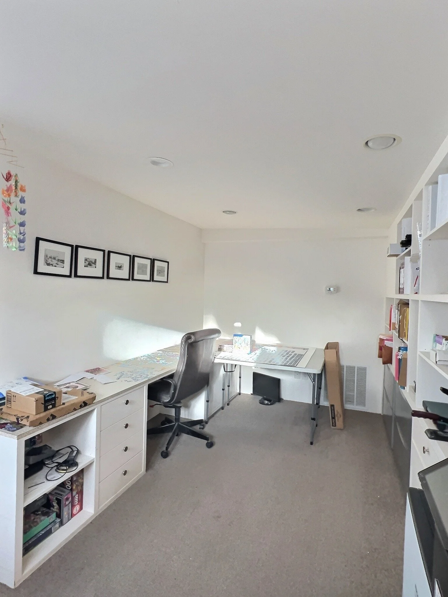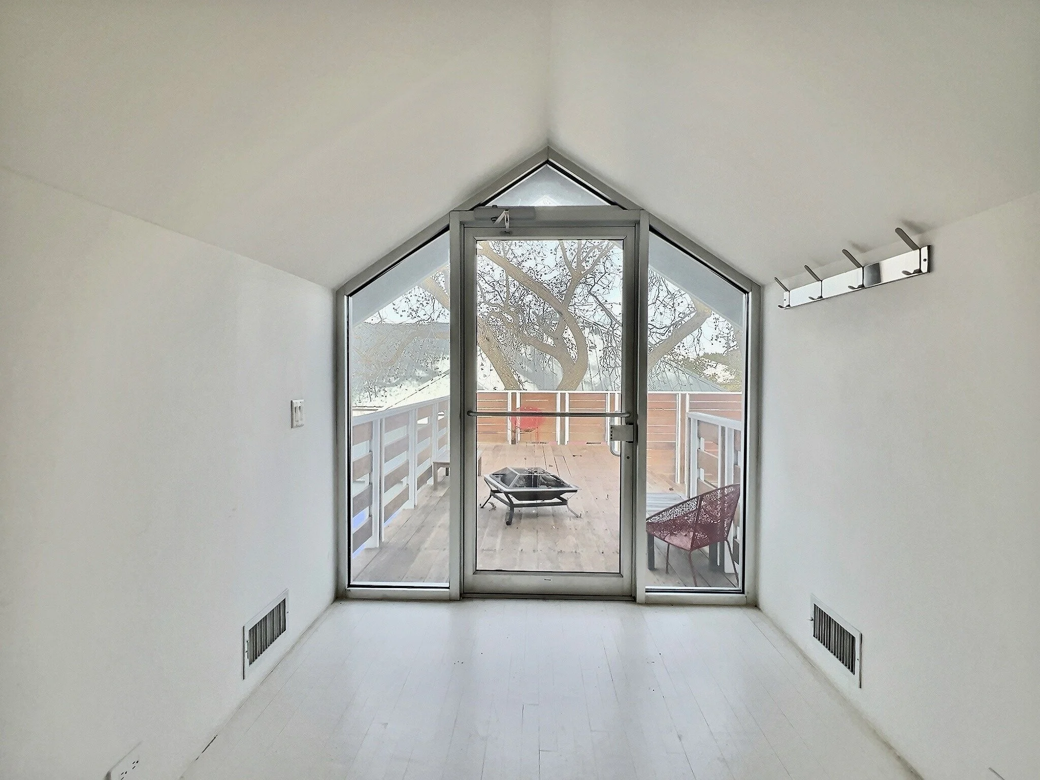 The secondary two-story building is accessed through the carport or backyard and features separate entrances for each unit. The property includes three additional units total: two two-bedroom units and one studio apartment. The downstairs space—currently used as a home office—offers a full kitchen and full bath and can easily be converted back to residential living. Upstairs, two units open onto a shared roof deck with stunning views of the courthouse. One unit features two bedrooms, one bath, a spacious living room, and a full kitchen, with additional access via a rear staircase from the backyard or alley. The second upstairs unit is a refined studio with elegant lines, a full bath, and access to the deck.