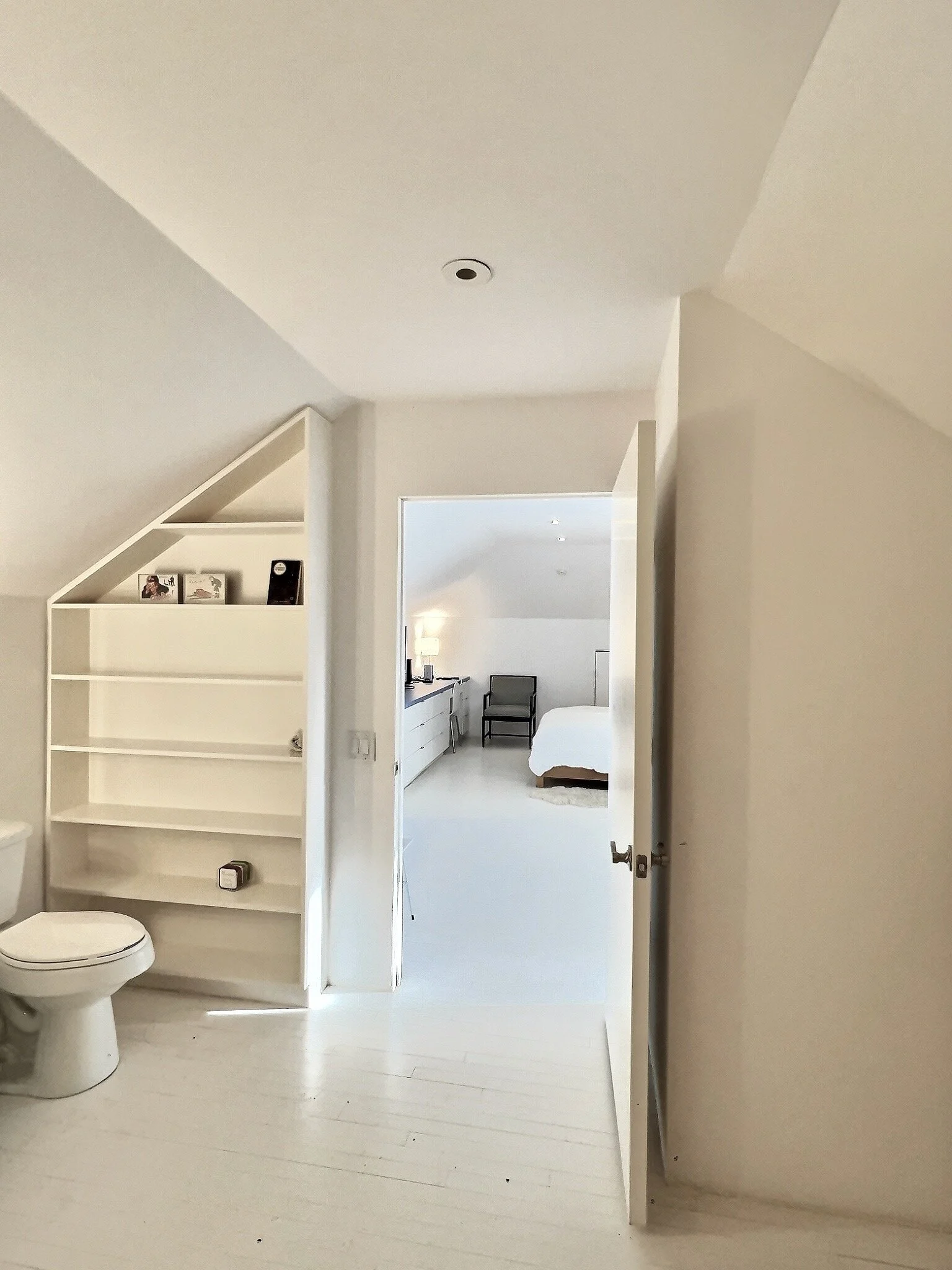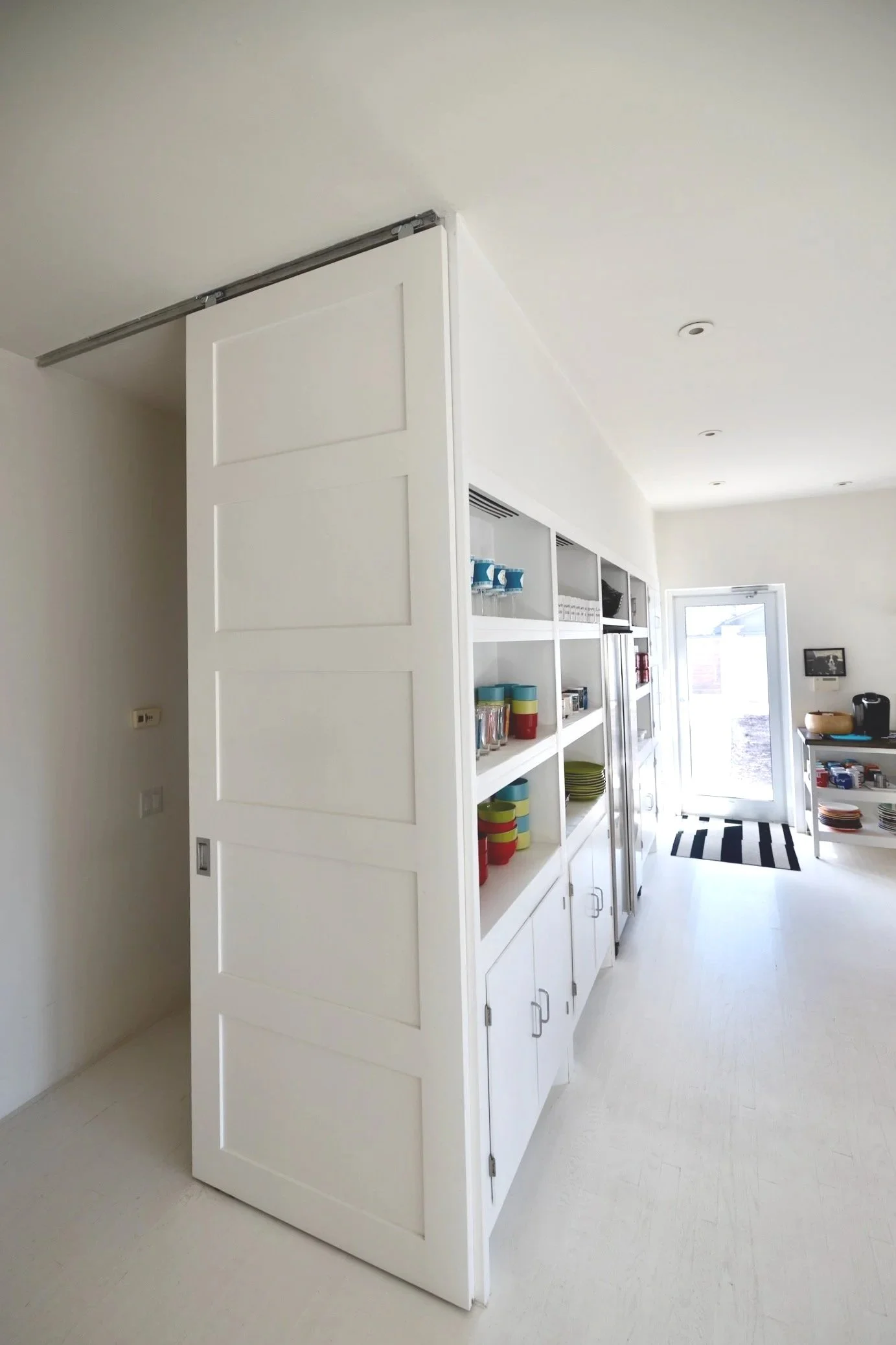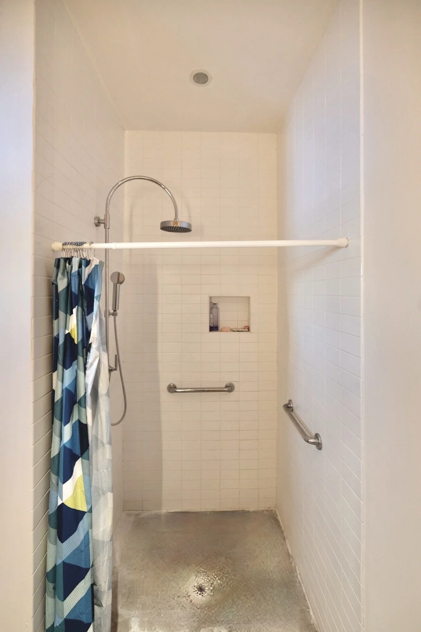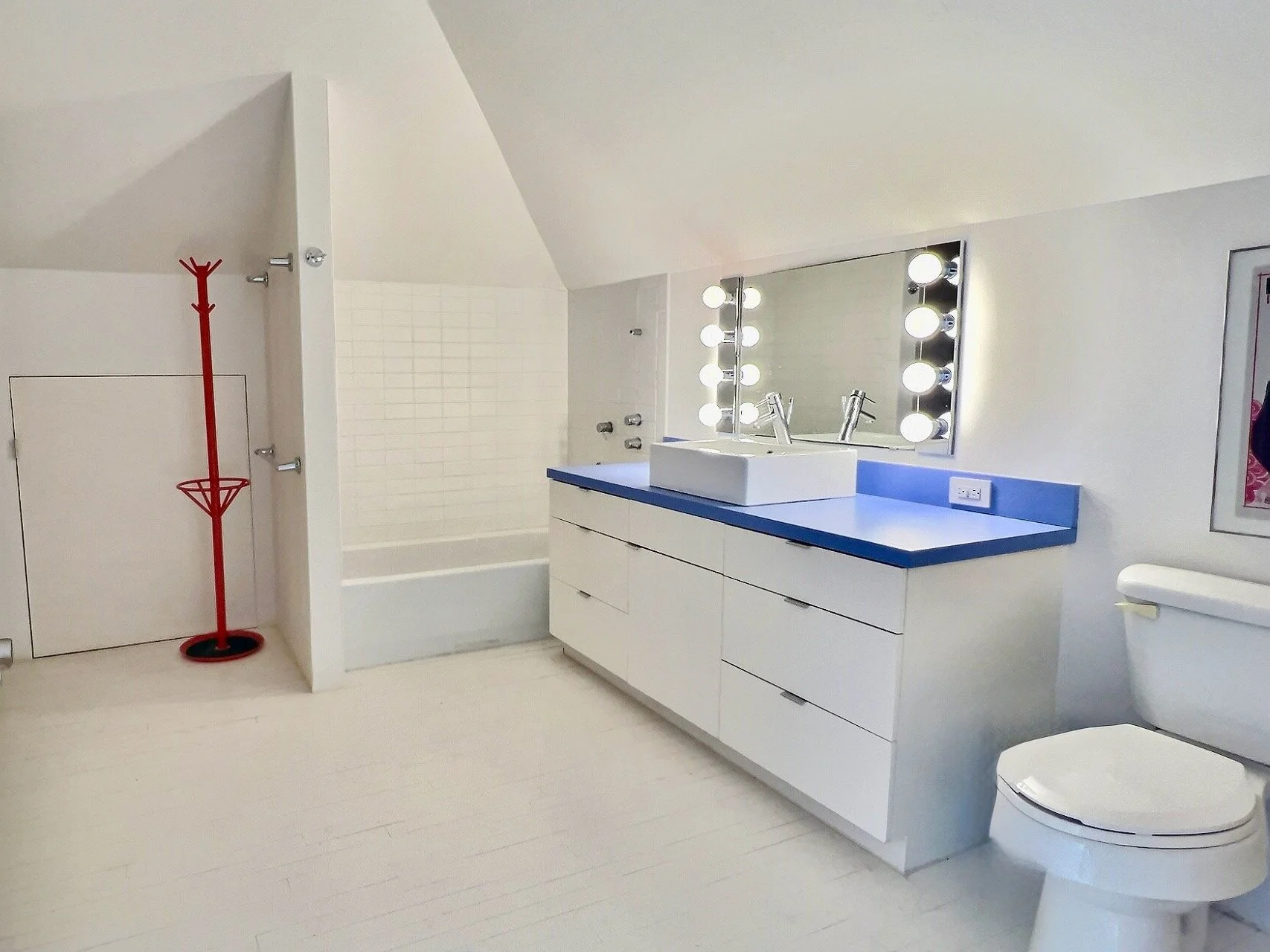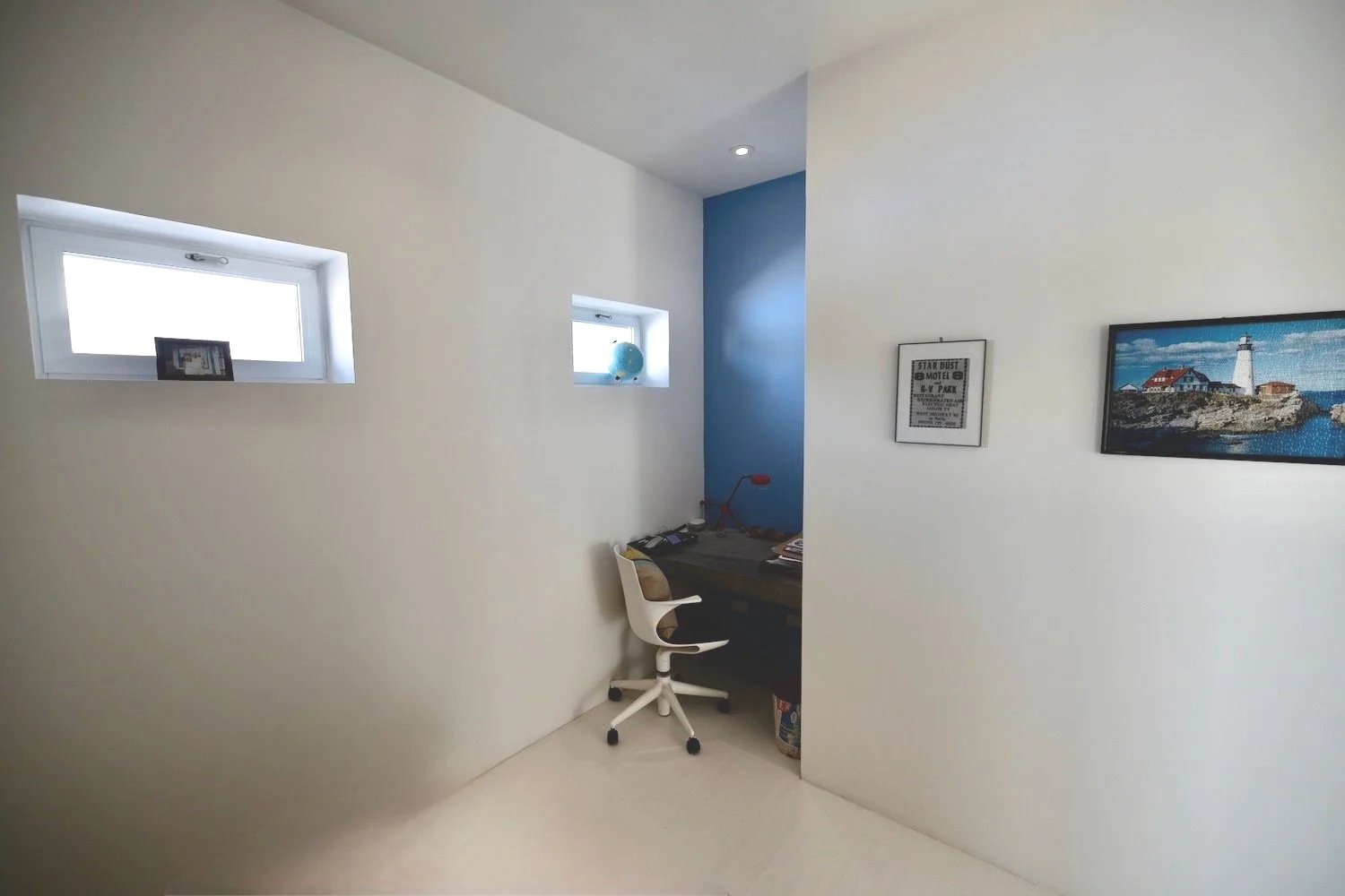 The secondary two-story building is accessed through the carport or backyard and features separate entrances for each unit. The property includes three additional units total: two two-bedroom units and one studio apartment. The downstairs space—currently used as a home office—offers a full kitchen and full bath and can easily be converted back to residential living. Upstairs, two units open onto a shared roof deck with stunning views of the courthouse. One unit features two bedrooms, one bath, a spacious living room, and a full kitchen, with additional access via a rear staircase from the backyard or alley. The second upstairs unit is a refined studio with elegant lines, a full bath, and access to the deck.