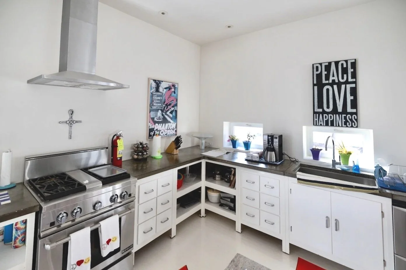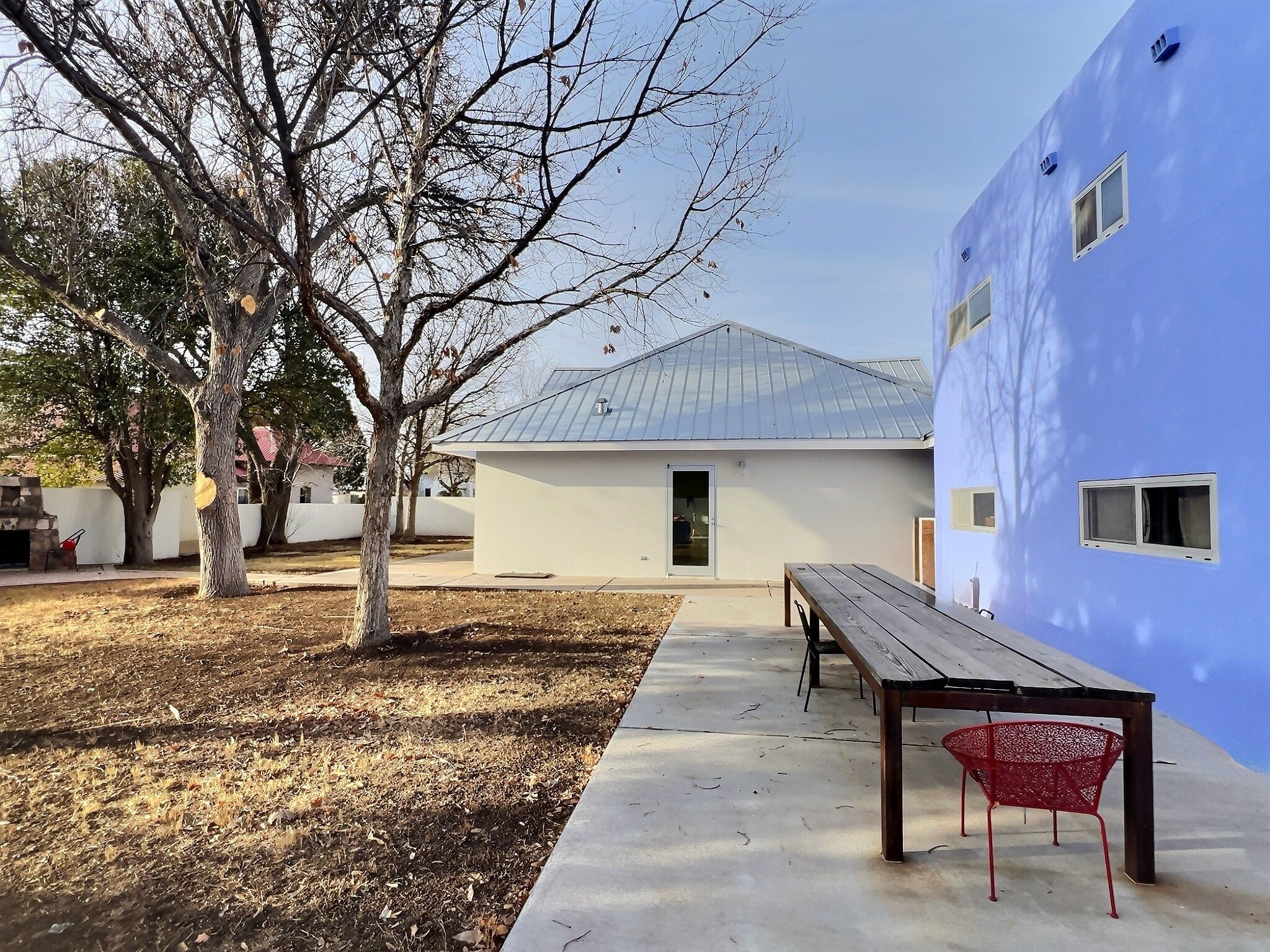 The original adobe residence, built circa 1920, underwent an extensive renovation in 2007, including updated electrical, plumbing, and systems throughout. The home was reimagined with an open-concept kitchen, living, and dining area ideal for both everyday living and entertaining. Two adjacent ensuite bedrooms can be closed off from the main living space, offering flexibility and privacy. Glass doors open to a large, private backyard with a dining patio and outdoor fireplace—perfect for enjoying Marfa’s mild climate and expansive West Texas skies. The open kitchen is well designed for cooking, featuring stainless steel appliances. Laundry hookups are located in the main house, with an additional laundry room on the ground floor of the secondary building. Approximate square footage of the main house is 1,700.