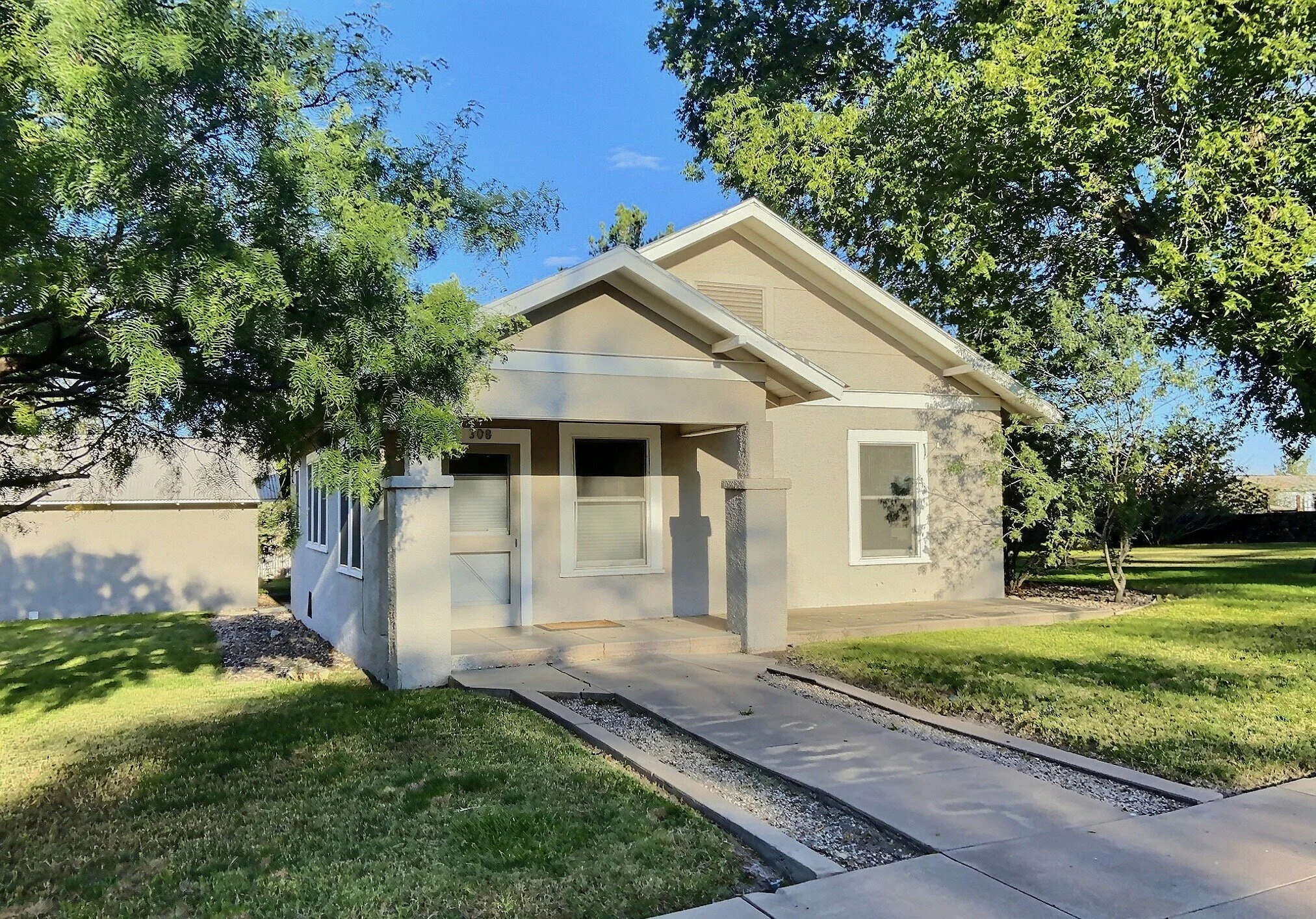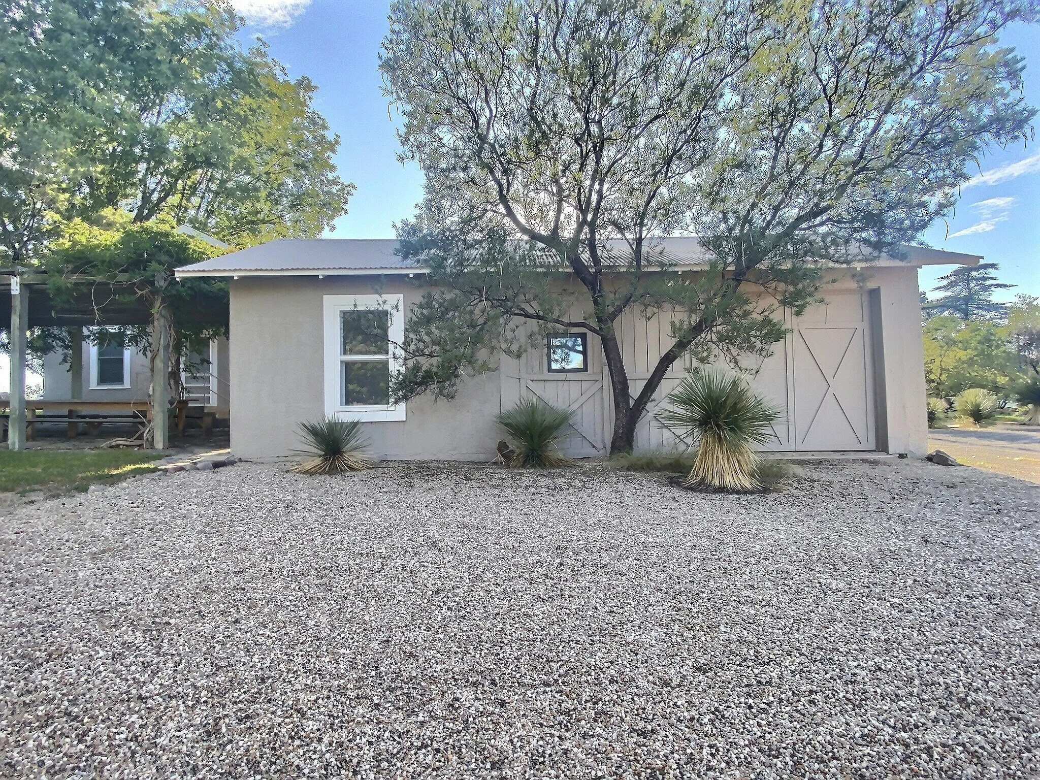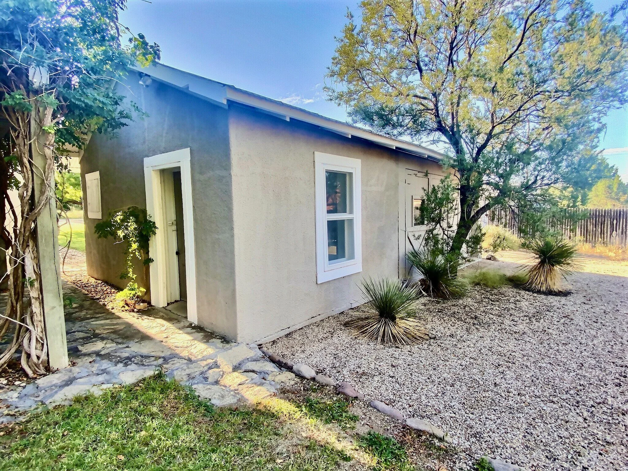 Located on a generously proportioned corner lot, this charming bungalow was part of the Lannan Foundation Residency program and was renovated to provide a comfortable and functional living/writing space. The home has a complete kitchen, living room, full bath and two bedrooms. One of the bedrooms was used as a writing study for the residency. The house has central air and heat, a garage with an adjacent storage room, and an outdoor dining area with a cupola over the picnic table. The garage could easily be transformed into another living space. Beautifully landscaped with old growth pecan trees and irrigated lawn, there are hardscaping areas for outdoor use as well as stone wall running the length of the southern boundary line. This is one of the three Lannan houses that was renovated by the architect Sharon Johnston from the firm Johnston/Macklee. The lines of the house are clean and the spaces open and bright, with wood floors, bookshelves and updated kitchen and bath. During the renovation, great care was taken to attend to reinforce the foundation and replace the windows with energy efficient double pane windows.