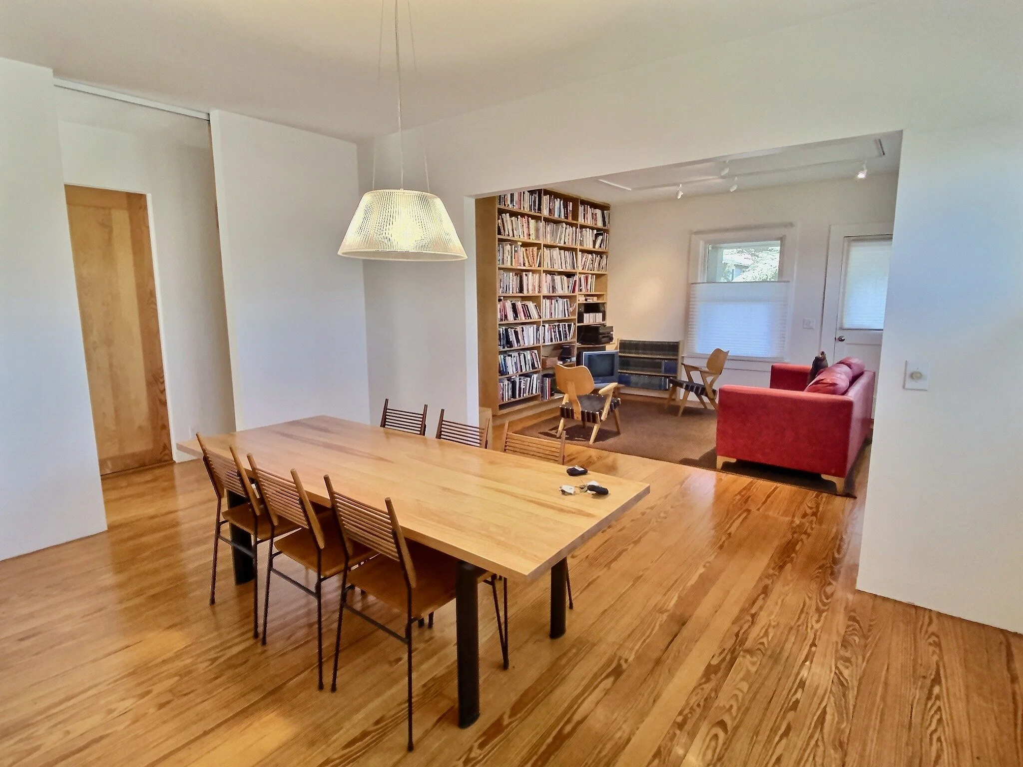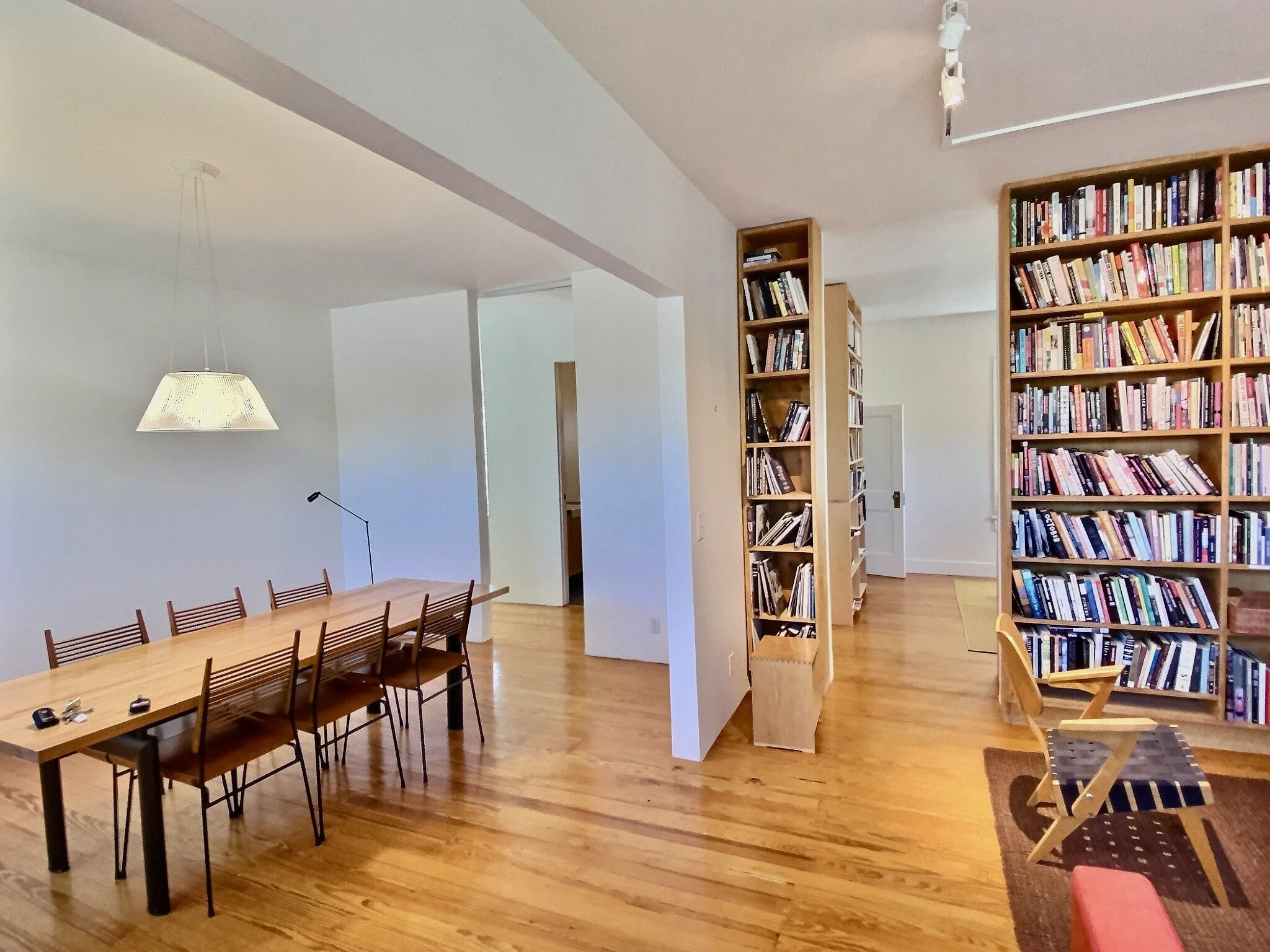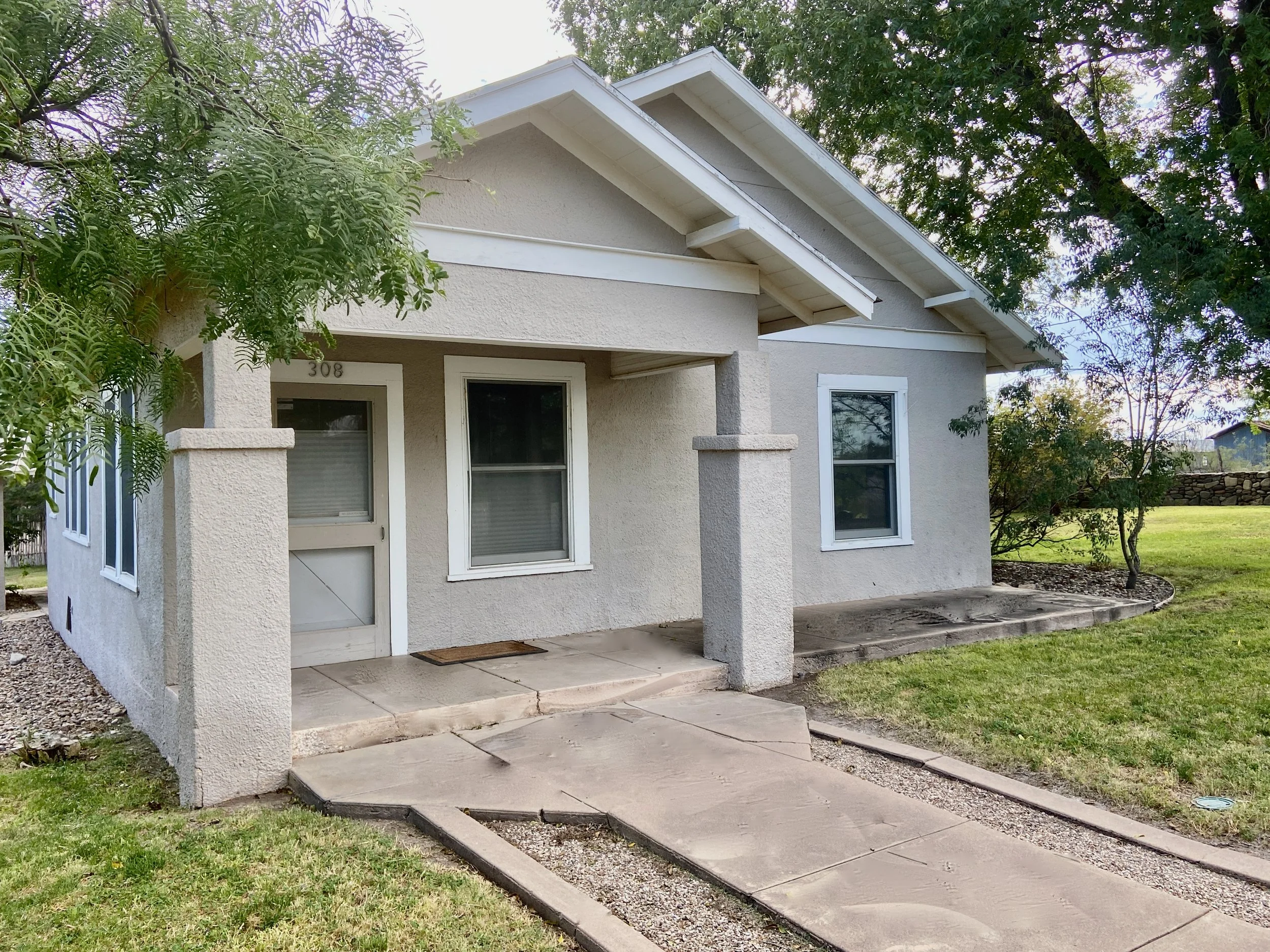 Located on a generously proportioned corner lot, this charming bungalow was part of the Lannan Foundation Residency program and was renovated to provide a comfortable and functional living/writing space. The home has a complete kitchen, living room, full bath and two bedrooms. One of the bedrooms was used as a writing study for the residency. The house has central air and heat, a garage with an adjacent storage room, and an outdoor dining area with a cupola over the picnic table. The garage could easily be transformed into another living space. Beautifully landscaped with old growth pecan trees and irrigated lawn, there are hardscaping areas for outdoor use as well as stone wall running the length of the southern boundary line. This is one of the three Lannan houses that was renovated by the architect Sharon Johnston from the firm Johnston/Macklee. The lines of the house are clean and the spaces open and bright, with wood floors, bookshelves and updated kitchen and bath. During the renovation, great care was taken to attend to reinforce the foundation and replace the windows with energy efficient double pane windows.