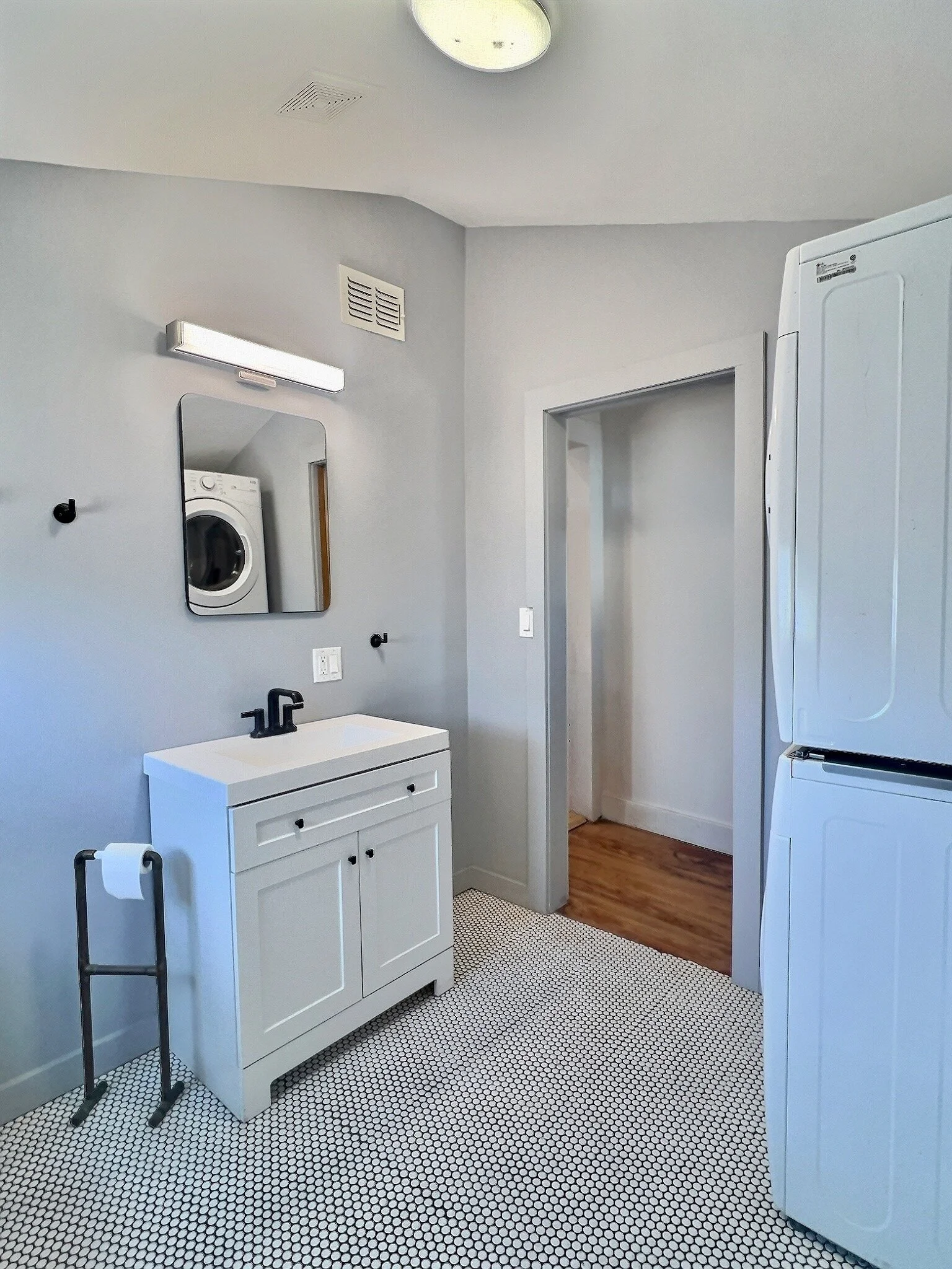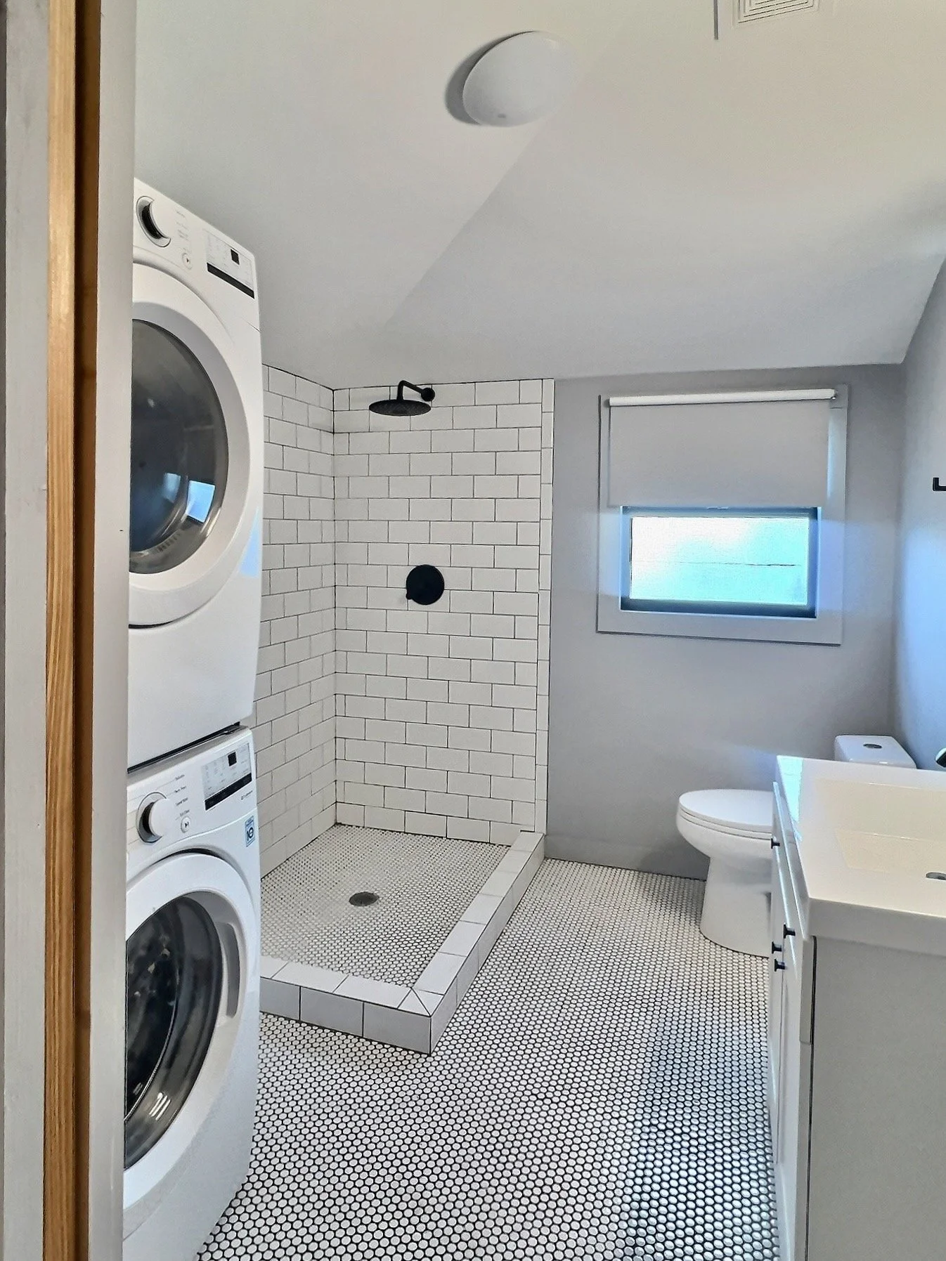 The bathroom has been tastefully renovated with modern fixtures and finishes, with a stackable washer/dryer unit. A bright white penny tile in the shower and white subway tile have been added. Additionally, a new HVAC system has been installed, providing efficient heating and cooling throughout the year.
